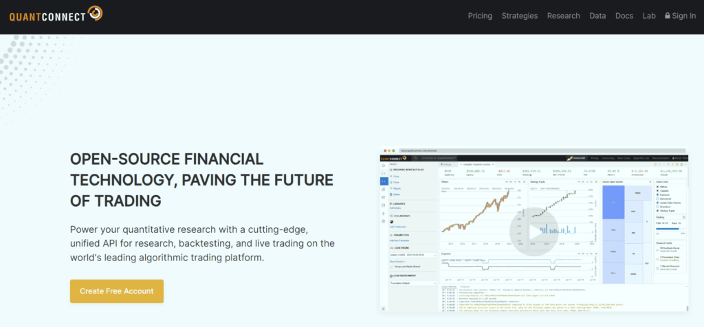 QuantConnect is an algorithmic trading platform that uses AI and machine learning to help traders develop, backtest, and deploy trading strategies. It supports multiple asset classes, including equities, forex, and cryptocurrencies. QuantConnect offers a rich data library, advanced backtesting capabilities, and a collaborative community of traders and developers.