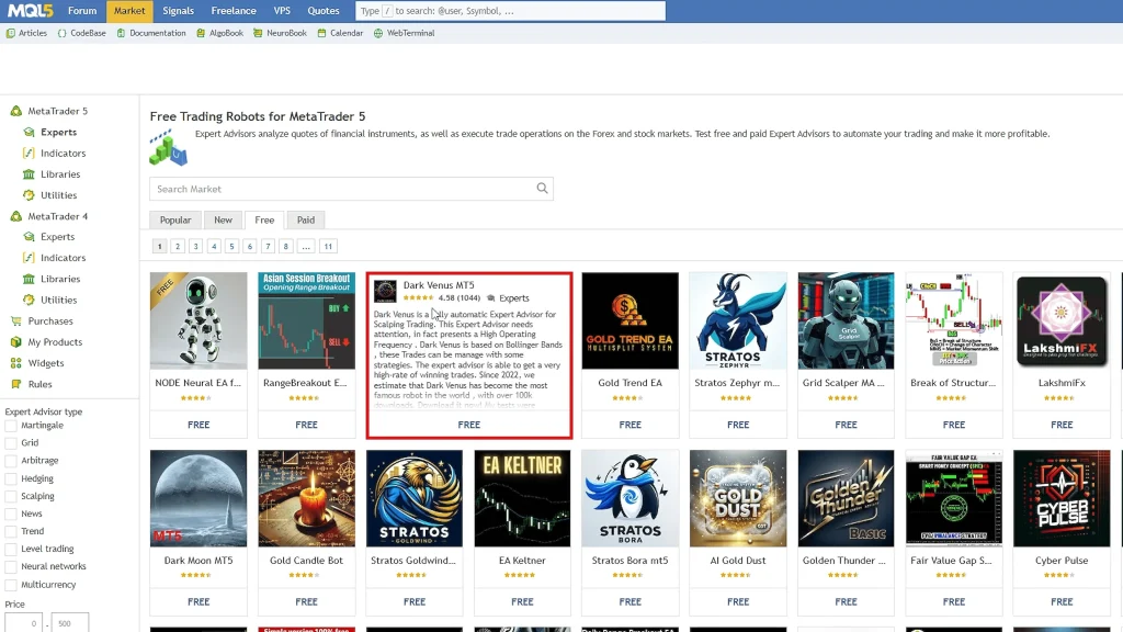 Dark Venus is completely free on the MQL5 marketplace. Here’s the installation process: