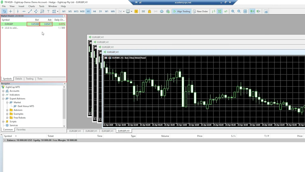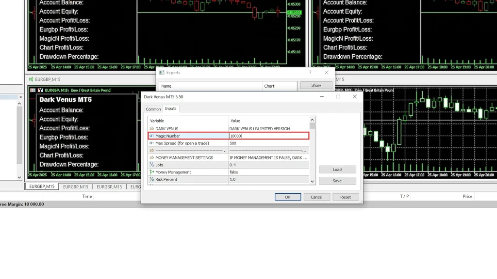 Before attaching Dark Venus to any charts, there’s one crucial step many traders skip, enable algo trading in MetaTrader. Without this enabled, the EA won’t execute any trades. Look for the “Algo Trading” button in your toolbar and make sure it’s activated.