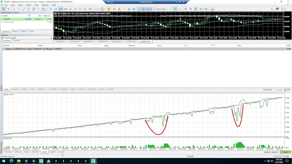 EUR/GBP has specific volatility characteristics and trading hour patterns that the EA’s logic appears tuned for. Switching to EUR/USD or GBP/USD might produce entirely different results, better or worse, I genuinely don’t know without testing.