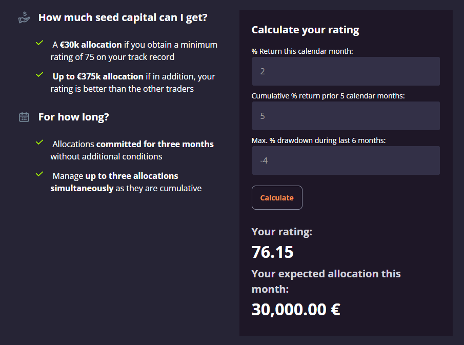 Darwinex Zero includes a Capital Allocation Calculator on their website, which traders can use to calculate their rating and potential allocations.
