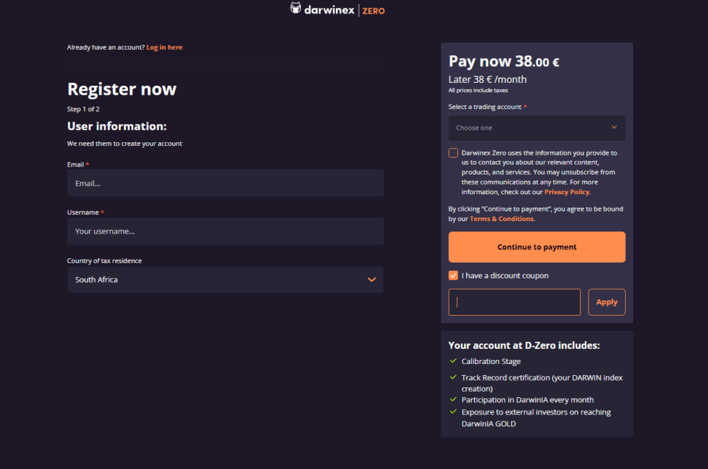 Signing up is simple. Register on the Darwinex Zero platform with a one-time fee of 95 Euros and a monthly fee of 38 Euros to join the contest and compete for the funds. New traders receive a 15% discount on the first fee.