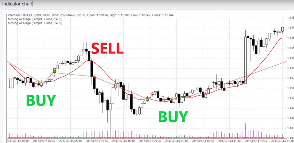 However, you would likely experience losses when the market moves sideways. This is because the moving average lags behind the price, particularly on lower time frames.