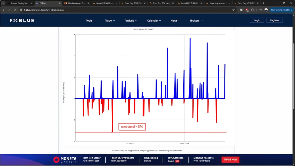 Yes, Forex Fury is actually excellent for prop firm challenges. Most prop firms impose strict drawdown limits, typically around 10%, and daily loss limits around 5%. Since Forex Fury’s maximum floating loss is approximately 3%, you have significant buffer room to meet profit targets without breaching risk limits.
