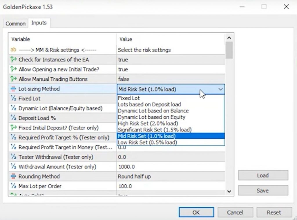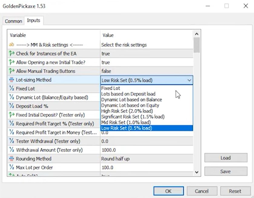 To simplify the setup process, the Golden Pickaxe EA provides pre-configured set files after purchasing on the MQL5 Market Place and downloading it. These set files align with different risk profiles, making it easier for traders to implement their desired risk settings. By loading the appropriate set file, you can quickly apply the recommended inputs for your preferred risk level.