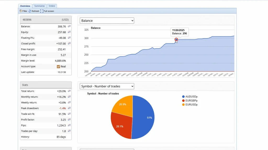 My BlackBull Markets account started with $200 on October 7th. After nearly three months, the balance sits at $306, a 53% gain with a profit factor of around 3.5.