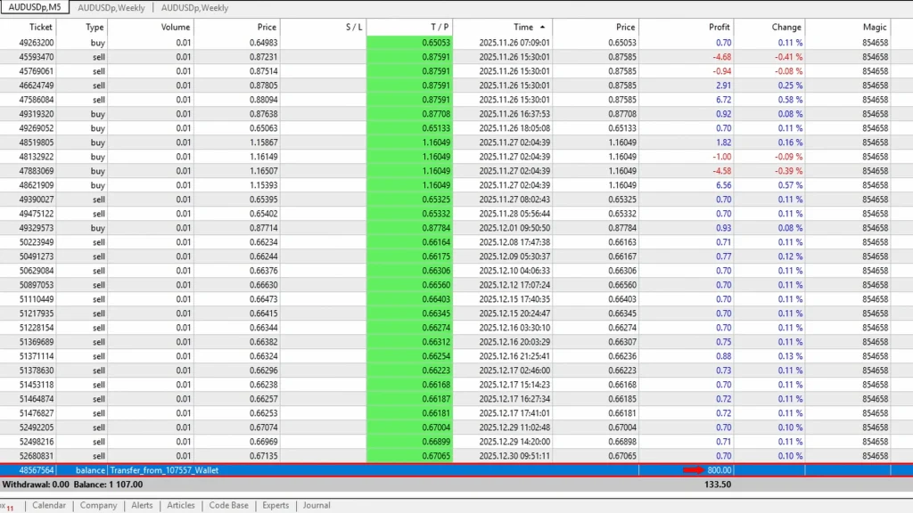 The current open trades confirm this: four AUD/USD positions dating from November 26th through late December. They’re sitting in small floating losses, but the EA continues taking new single trades that close profitably while waiting for the grid to recover.