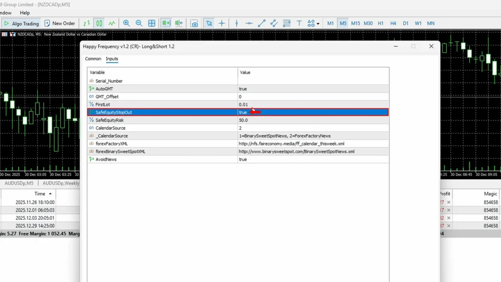 The equity stopout automatically closes all Happy Frequency trades when the floating drawdown reaches your specified threshold (default 50%). On my upgraded $1,000 account, I enabled this at 50%, meaning if equity drops to $500, the EA liquidates everything to prevent further losses.