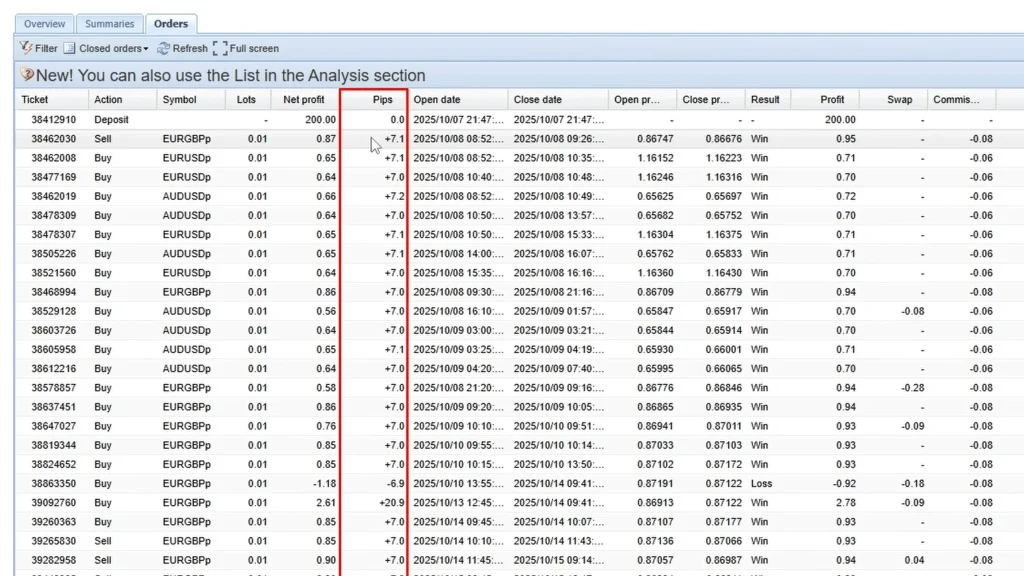 Looking at the trade history, you can see the pattern clearly. Single trades closing for 7 pips profit. Then sequences where two trades opened days apart, both at 0.01 lots, closing simultaneously for a combined 14 pips (7 pips per trade maintained).