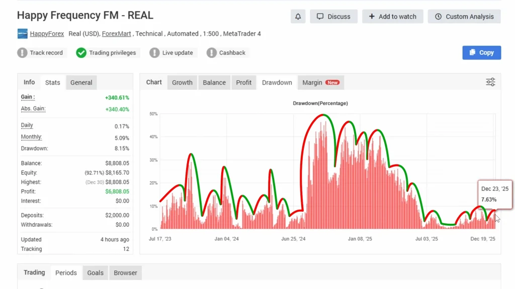 Happy Frequency comes from the same developer behind Happy Forex and Happy Gold, systems I’ve tested successfully. This EA is extremely active, targeting 7 pips per trade across multiple currency pairs on the M5 timeframe. The vendor’s track record shows 340% profit since July 2023 on a $2,000 account.