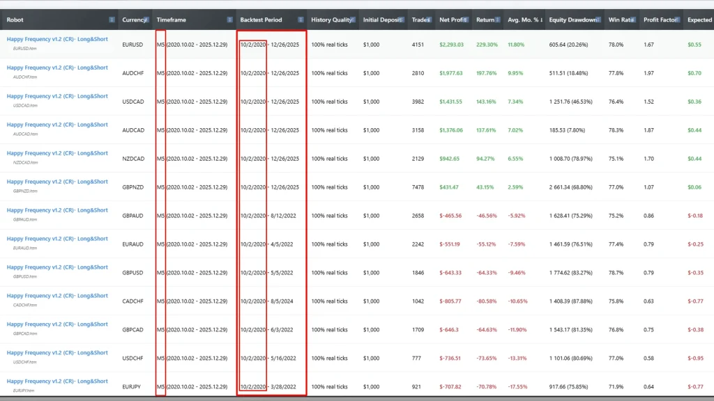 You can experiment with non-standard pairs as I’m doing with NZD/CAD, but proceed cautiously. The vendor optimized Happy Frequency for specific currencies shown in their track record. My 28-pair backtesting revealed that some untested pairs performed well historically, but backtests don’t guarantee future results.