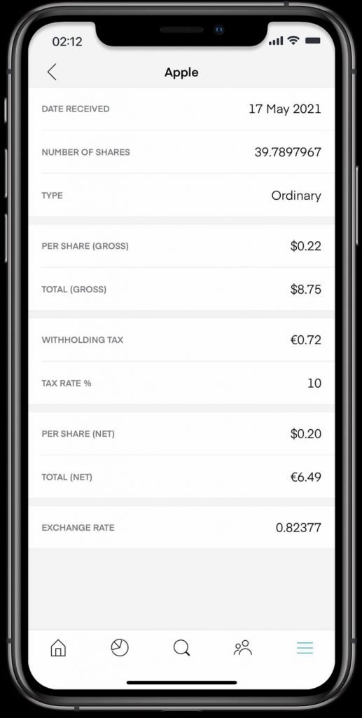The Trading 212 app keeps records of all the transactions that you’ve done with each stock. For example, you could see all the transactions that you’ve done with Apple stock. You could also view the dividends that have been paid out for the stock.