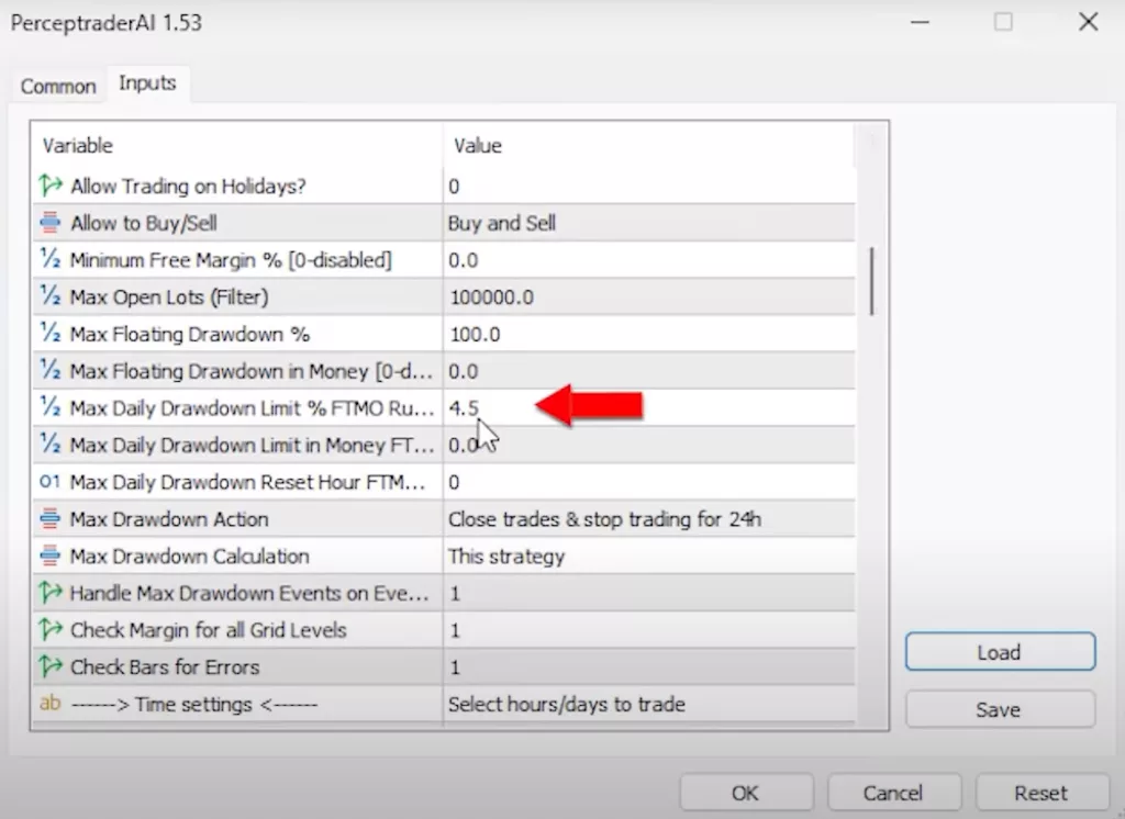 With prop firms, risk management is paramount. Their trading objectives often require traders to minimize risks. On my demo account, where I’ve been testing Perceptrader AI, I’ve maintained a low-risk setting. There’s a myriad of parameters available for tweaking, ensuring optimal performance tailored to specific needs.