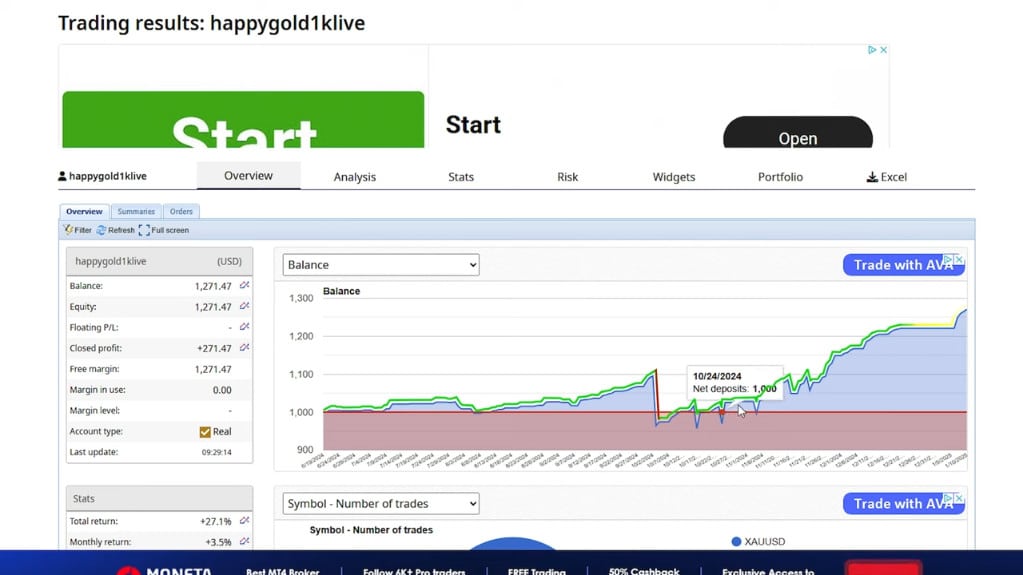 A proven strategy should have a historical track record demonstrating its effectiveness. For example, let’s have a look at the live trading results for one of the Expert Advisors we use – the Happy Gold Trading EA on a $1,000 account. Here you can see exactly how the strategy performed, which is a real track record. There was an initial drawdown followed by recovery. And now we see a total return of nearly 30% over time. That shows us consistent performance under different market conditions.
