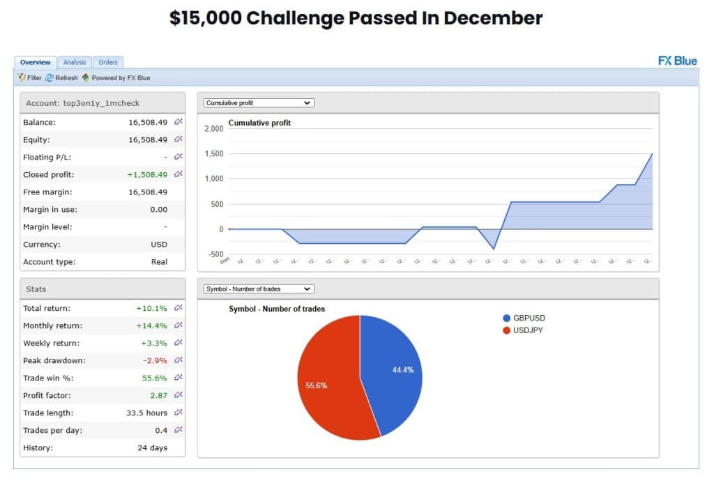 On one of our accounts we trade the Forex Gold Investor (FGI) Expert Advisor and we are now on the second stage. We started with a $10,000 account and when a 20% profit was achieved, the account was upgraded to the $20,000 level. Upon achieving the 20% profit, we could already withdraw $1,600, which covers the initial investment, and leaves traders a larger account to trade with. On the second stage the profit target is $24,000.