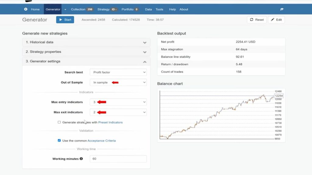 In this step, we also set basic filters for the acceptance criteria, like a minimum number of 150 trades and a profit factor of 1.1 or higher. This is to ensure that the strategy generates a reasonable number of trades and remains profitable. And for the strategy properties, we’ve used fixed take profit and stop loss between 20 and 120 Pips. And for the generation, we have set a maximum of three entry indicators and a maximum of two exit indicators.