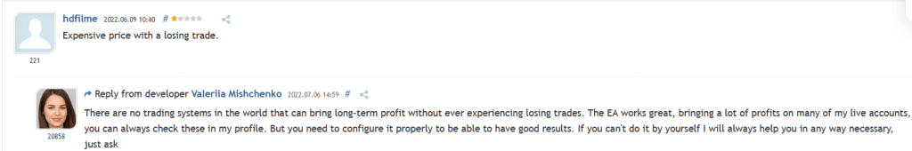 While the Night Hunter Pro boasts predominantly positive feedback, there are a few negative reviews worth noting. For instance, one user mentions the high price in relation to a losing trade. It’s important to keep in mind that losses are an inherent part of trading, even with expensive Expert Advisors. Evaluating the overall performance and considering the long-term results is crucial in assessing the effectiveness of any trading system.