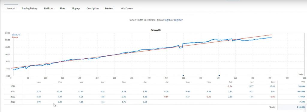 Looking at the live performance of the Night Hunter Pro, we can see that the total profit stands at an impressive 216%. Breaking it down by year, we observe a 7.39% profit in the current year, 17% in 2022, 106% in 2021, and 20% in 2020. While the recent numbers show a decline, it is possible that the developer has adjusted the risk settings to mitigate potential losses. Nonetheless, a 17% profit for the previous year is satisfactory.