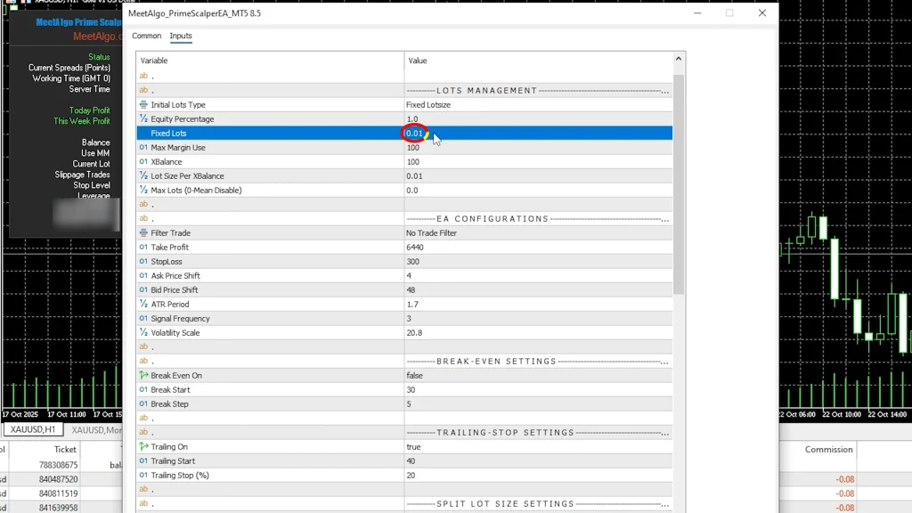 Instead, I configured it for fixed lot sizing at 0.01 lots. Why? Because on a small $200 account trading gold, I wanted to control risk tightly while the EA proves itself. As the account grows, I can adjust position sizing accordingly.