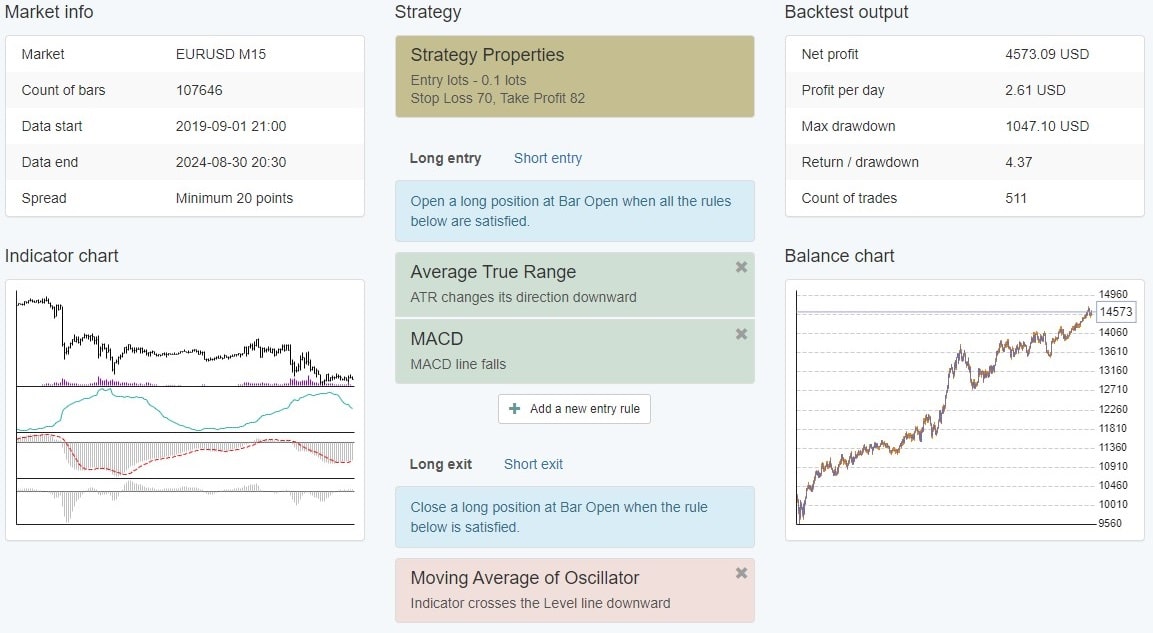 The effectiveness of this strategy largely depends on the technical indicators it uses to generate trading signals. These indicators are carefully selected to complement each other. They provide a comprehensive view of market conditions, including trend direction, momentum, and volatility. The three primary indicators used in this trend following strategy are the Average True Range (ATR), the Moving Average Convergence Divergence (MACD), and the Moving Average of Oscillator (OsMA).