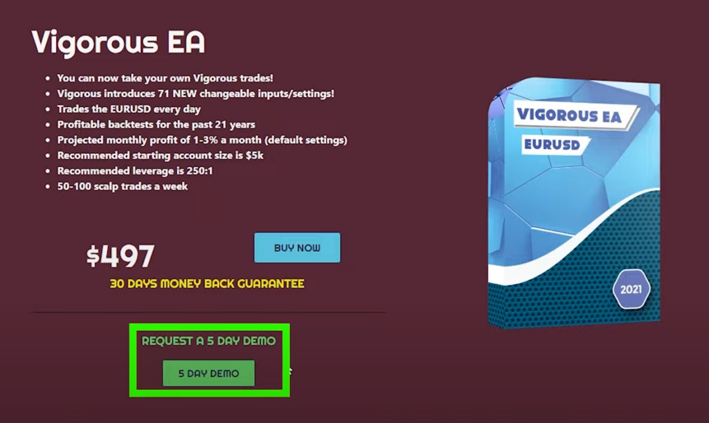 The vendor offers a 5-day demo and a 30-day money-back guarantee, allowing you to test the robot before making a commitment.